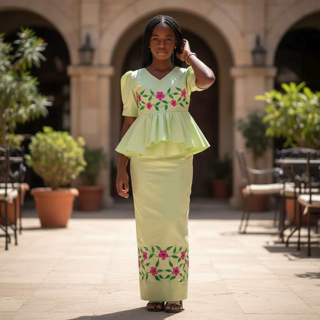 Offrez à votre fille de 11 ans l’élégance raffinée d’un ensemble bazin riche conçu spécialement pour les grandes occasions. Ce magnifique ensemble cérémonie fille vert clair, composé d’un haut brodé et d’une jupe assortie, incarne le charme traditionnel revisité pour jeune fille moderne. Idéal pour les cérémonies, fêtes familiales ou événements culturels, cet ensemble mettra en valeur la beauté et la grâce de votre enfant à chaque instant. Le bazin riche fille 11 ans séduit par sa teinte vert clair lumineuse, symbole de jeunesse et de fraîcheur. La broderie florale aux couleurs éclatantes, composée de fleurs roses et de feuilles vertes intenses, apporte une touche artisanale unique et raffinée. Fabriqué dans un tissu de qualité supérieure, à l’aspect légèrement brillant et au toucher doux, cet ensemble garantit un confort optimal tout en offrant une allure sophistiquée. La coupe traditionnelle avec taille cintrée et jupe droite longue est rehaussée par un élégant peplum structuré, accentuant la silhouette de votre fille avec délicatesse. Le haut présente un décolleté carré et des manches courtes légèrement bouffantes, ajoutant une note féminine et distinguée. Les broderies, présentes sur le corsage et la jupe, créent un équilibre harmonieux qui fait de cet ensemble un vêtement cérémonie enfant d’exception. Parfait pour toutes les occasions spéciales, cet ensemble haut et jupe fille est également un excellent choix comme robe africaine enfant ou tenue événement fille 11 ans. Avec ce bazin riche fille 11 ans, vous offrez à votre enfant un vêtement festif fille aussi élégant que confortable, prêt à faire sensation lors de chaque cérémonie. N’attendez plus pour sublimer le style de votre fille avec cette robe traditionnelle fille élégante, un incontournable du dressing des grandes occasions. Découvrez vite cette tenue unique et faites de chaque événement un souvenir inoubliable.