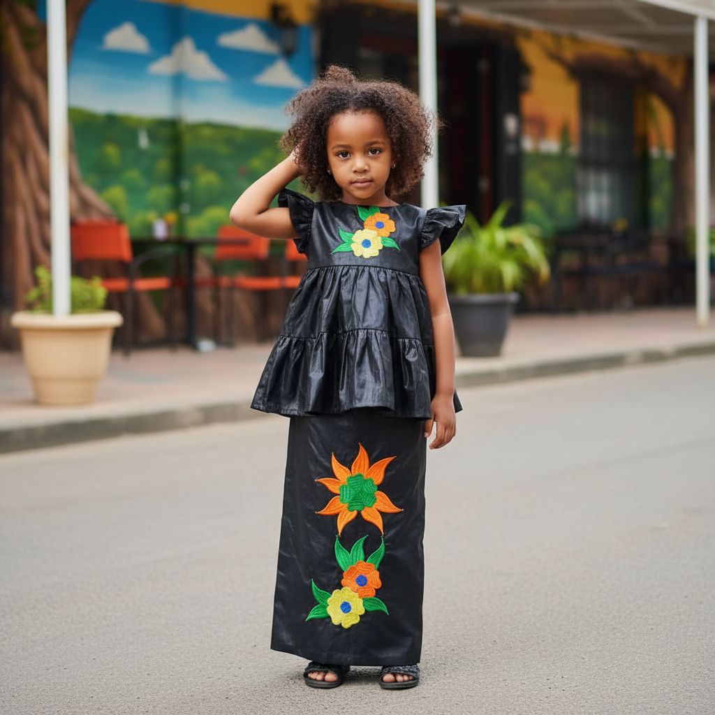 Ensemble bazin riche fille 4 ans noir, jupe longue et haut brodé, idéal cérémonie ou événement, allie élégance traditionnelle et confort pour enfant. ❀ Taille : adaptée aux filles de 4 ans, ensemble jupe longue et haut ❀ Couleur : noir avec broderies florales colorées (orange, jaune, vert, bleu) ❀ Matière : tissu synthétique souple avec finition brillante, léger et confortable