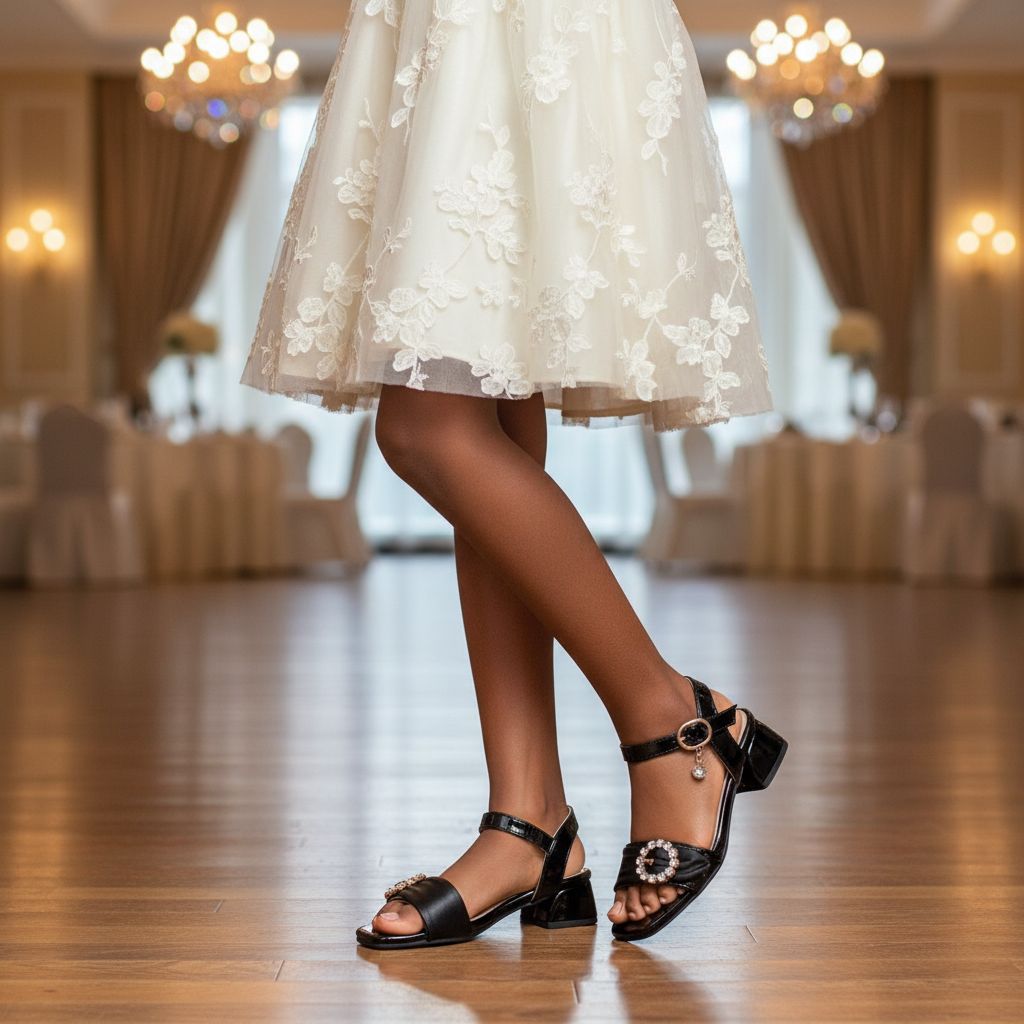 Leur design chic et moderne séduit dès le premier regard : la brillance du cuir verni ou similicuir noir est délicatement relevée par des touches dorées, notamment au niveau de la boucle et des petits ornements pendants. Un cercle décoratif en strass éclatants sur le dessus de la chaussure attire subtilement la lumière, rappelant l’élégance des chaussures de soirée fille. Ces sandales noires cérémonie enfant allient ainsi minimalisme et détails glamour, pour un effet vraiment sophistiqué.