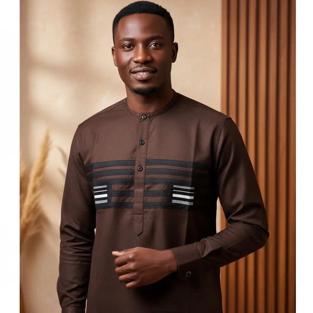 Découvrez la chemise homme coton marron foncé manches longues pagne tissé élégante, une pièce unique qui allie raffinement et authenticité. Conçue pour les amateurs de vêtements artisanaux, cette chemise traditionnelle homme coton séduit par son style ethnique et ses finitions soignées. Sa teinte marron foncé, sobre et masculine, s’associe parfaitement à une coupe droite moderne et un col rond sans revers, offrant une allure élégante et décontractée à la fois. Le pagne tissé, mis en valeur par une bande décorative noire rehaussée de motifs géométriques blancs sur le torse, souligne un savoir-faire traditionnel exceptionnel. Chaque détail de cette chemise pagne tissé homme reflète l’attention portée à la qualité et à l’originalité, faisant de ce vêtement homme style africain un incontournable pour ceux qui souhaitent exprimer leur personnalité tout en adoptant une mode éthique et naturelle. Fabriquée en coton épais et respirant, cette chemise homme éthique et naturelle garantit un confort optimal tout au long de la journée. Les boutons noirs sur le devant et aux poignets facilitent l’ajustement des manches longues, pour un port adapté à toutes les circonstances. Que ce soit pour une occasion formelle, une réunion professionnelle ou une sortie entre amis, cette chemise homme polyvalente occasion formelle s’adapte à toutes les envies et met en valeur votre silhouette avec distinction. Optez pour une chemise artisanale homme qui conjugue élégance, durabilité et respect des traditions. Laissez-vous séduire par l’authenticité de ce vêtement et ajoutez à votre garde-robe une pièce forte qui saura attirer tous les regards. N’attendez plus pour adopter la chemise homme coton marron foncé, symbole d’un style affirmé et d’un engagement pour une mode responsable.