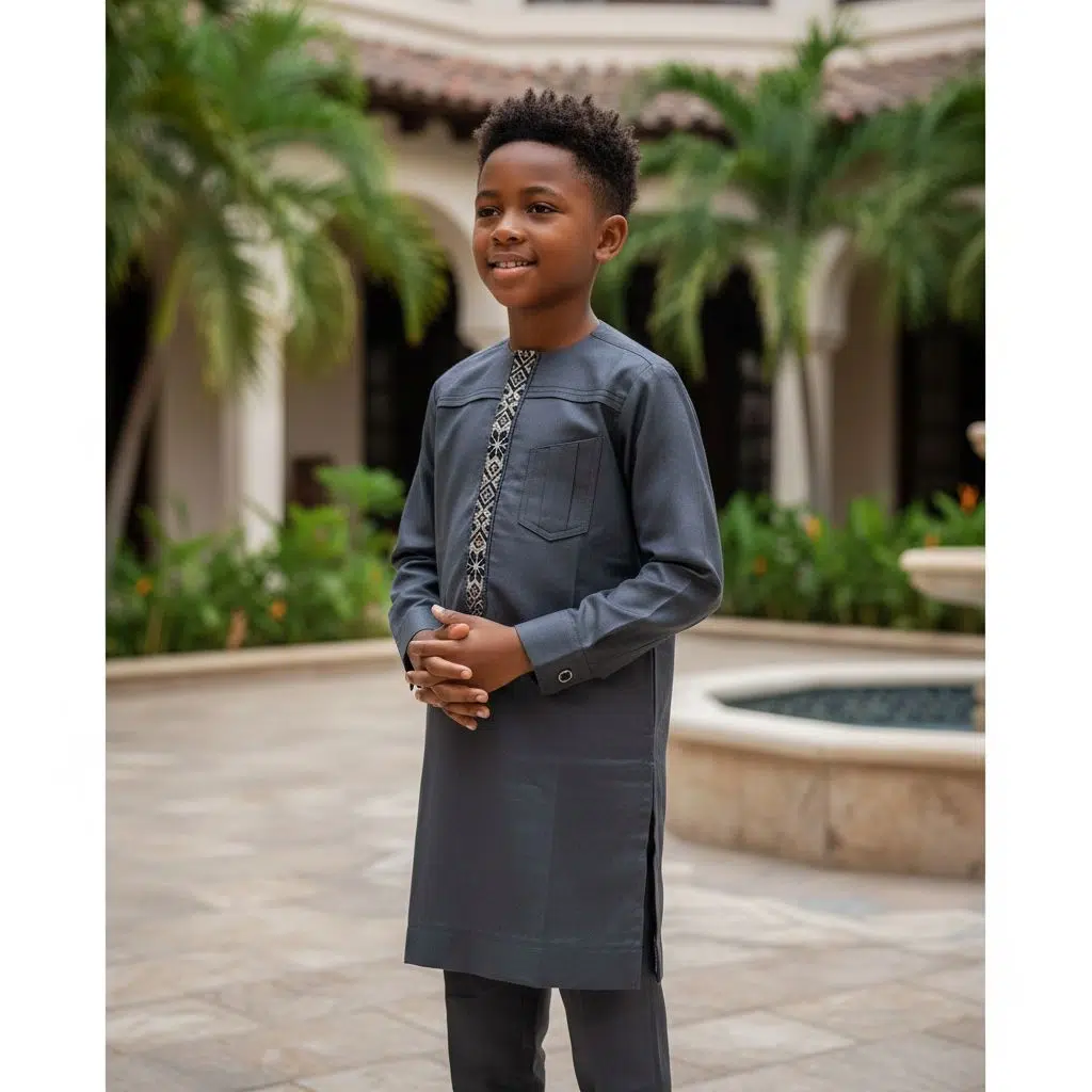 Offrez à votre enfant une allure élégante et authentique avec ce costume africain garçon en gris foncé, conçu spécialement pour les cérémonies et grandes occasions. Cet ensemble traditionnel africain enfant séduit par sa coupe droite raffinée et son tissu de qualité supérieure, principalement composé de coton, assurant à la fois douceur, confort et résistance. Grâce à ce vêtement cérémonie garçon africain, votre garçon sera à la fois à l’aise et parfaitement habillé, prêt à marquer les esprits lors d’événements importants. Ce costume africain garçon se distingue par sa couleur gris foncé, sobre et moderne, idéale pour toutes les saisons et facile à associer avec différents accessoires. Le détail phare réside dans le motif ethnique noir et blanc qui orne la patte de boutonnage et le col, rappelant la richesse des cultures africaines tout en restant discret et élégant. Cette touche artisanale apporte originalité et caractère à cette tenue cérémonie garçon coton, tout en soulignant l’identité culturelle du vêtement. Pensé aussi bien pour les mariages, baptêmes, fêtes traditionnelles que pour les sorties spéciales, ce costume garçon gris foncé répond à toutes les exigences d’une tenue élégante garçon mariage. Sa poche poitrine ajoute un aspect pratique à ce costume enfant motif ethnique, permettant à votre garçon d’emporter facilement un petit mouchoir ou un accessoire discret. L’ensemble garçon mariage africain est ainsi parfaitement adapté pour les moments d’exception où le raffinement et la tradition sont à l’honneur. Le choix de matières durables et la coupe soigneusement travaillée garantissent une tenue agréable qui accompagne votre enfant tout au long de la journée. Ce costume enfant cérémonie africain est recommandé à tous les parents souhaitant offrir à leur fils une pièce unique, alliant élégance moderne et héritage traditionnel. N’attendez plus pour faire de chaque évènement une célébration du style et de la culture : commandez dès maintenant cet ensemble exceptionnel parmi nos habits traditionnels garçon coton et faites rayonner l’élégance africaine lors de vos prochaines cérémonies.