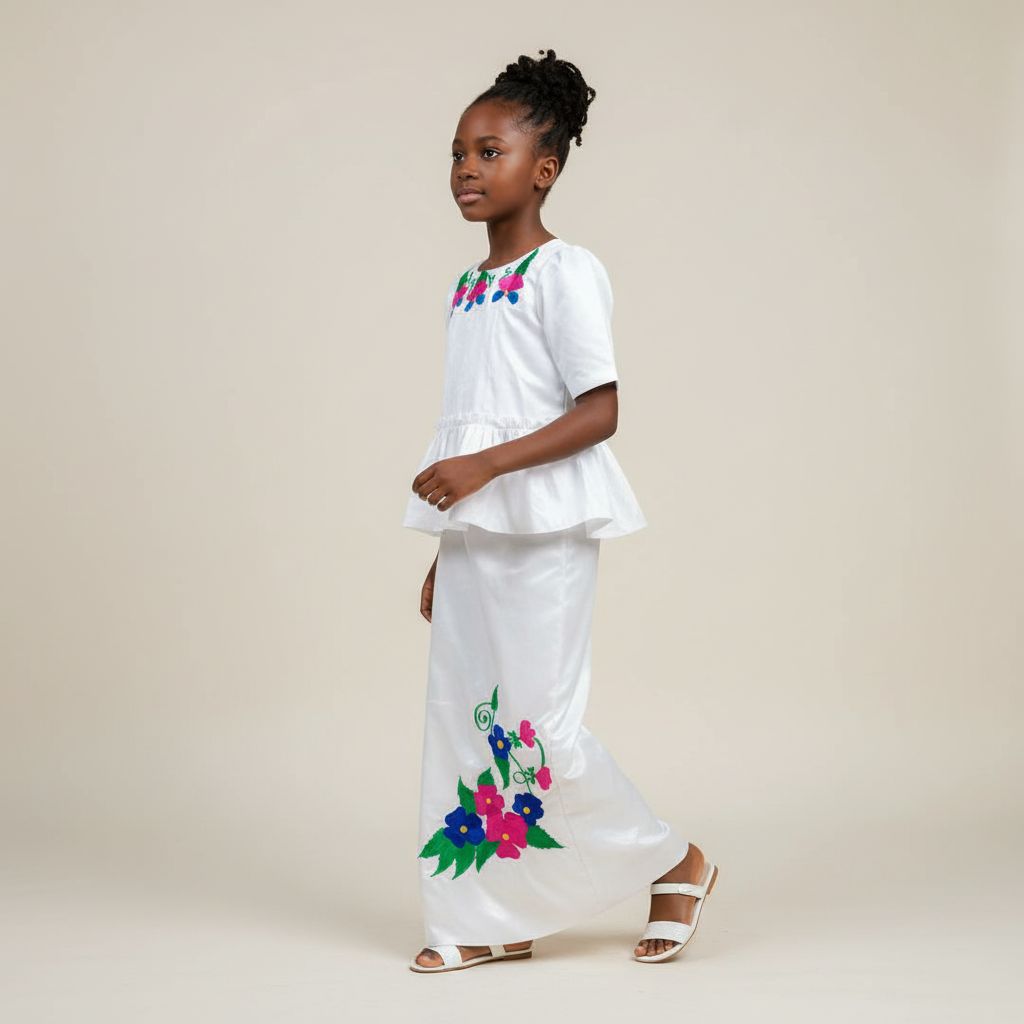 Ensemble cérémonie fille 9 ans blanc, jupe longue et haut floral brodé, idéal mariage, fête ou événement, style traditionnel chic et confortable. ❀ Ensemble 2 pièces : jupe longue droite et haut manches courtes, taille 9 ans ❀ Couleur blanc immaculé, broderies florales rose, bleu et vert ❀ Tissu satiné lisse, léger et confortable pour les cérémonies