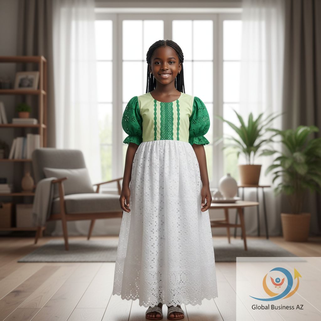Pensée pour les grandes occasions comme les mariages, les fêtes familiales ou les cérémonies religieuses, cette robe verte olive fillette allie élégance et praticité. Sa coupe classique et son tissu respirant en font une tenue chic dentelle fille tout aussi adaptée aux longues journées de fête qu’aux moments de jeux. Grâce à sa conception soignée, chaque détail reflète l’excellence artisanale et la richesse culturelle du bazin, faisant de cette robe une pièce unique dans la garde-robe de votre enfant.