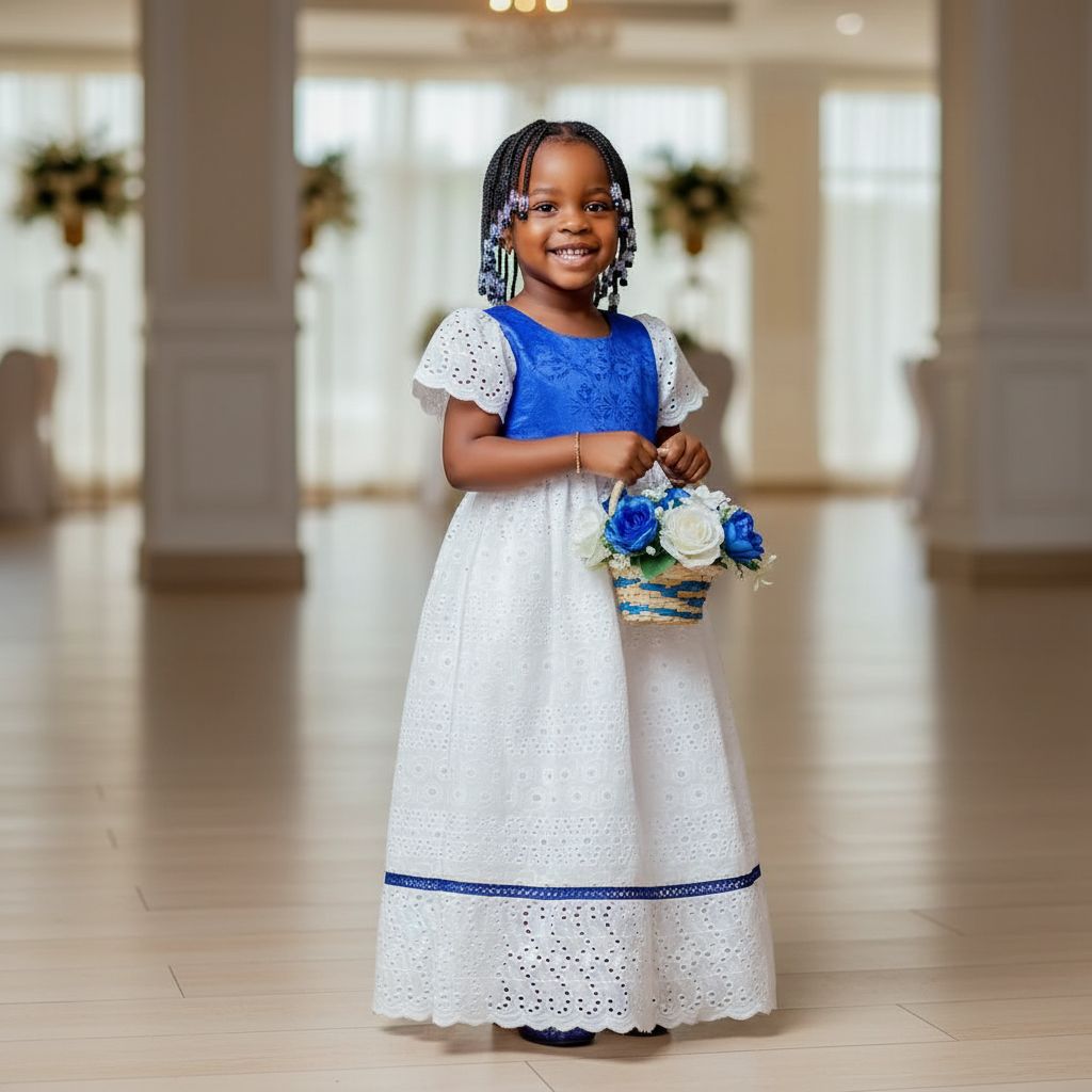 Offrez à votre petite fille une allure exceptionnelle lors des grandes occasions avec cette sublime robe cérémonie fille 2 ans, conçue pour marquer chaque événement d’une élégance raffinée. Cette robe brodée blanche et bleue pour enfant séduit par son association unique entre un haut en bazin riche bleu bic, à la texture douce et luxueuse, et une jupe en coton brodé blanc ajouré, légère et respirante. Les manches courtes volantées et la finition en broderie anglaise apportent une touche vintage irrésistible, idéale pour une tenue cérémonie fille chic et intemporelle. Pensée pour le confort et le style, cette robe élégante enfant fête est confectionnée dans des matières naturelles assurant une excellente respirabilité, parfaite pour les longues journées de célébration. La coupe ample et la douceur des tissus permettent à votre enfant de se mouvoir librement, tout en conservant une allure distinguée. La bande bleue contrastante située en bas de la jupe souligne délicatement la silhouette et fait de ce vêtement fille occasion spéciale une pièce vraiment unique. Que ce soit pour un baptême, un mariage, un anniversaire ou toute autre réception, cette robe classique fille coton brodé s’impose comme un choix incontournable. Son design raffiné allie tradition et modernité, offrant à votre enfant une apparence soignée et une grande élégance. Privilégier cette robe vintage broderie anglaise, c’est choisir une tenue raffinée et confortable qui fera sensation lors de chaque événement important. N’attendez plus pour faire de votre petite fille la star de la fête avec cette robe réceptions enfant blanche et bleu, un vêtement de qualité supérieure alliant confort et beauté. Ajoutez dès maintenant cette robe en bazin riche bleu bic à sa garde-robe et laissez-la briller lors de chaque occasion spéciale.