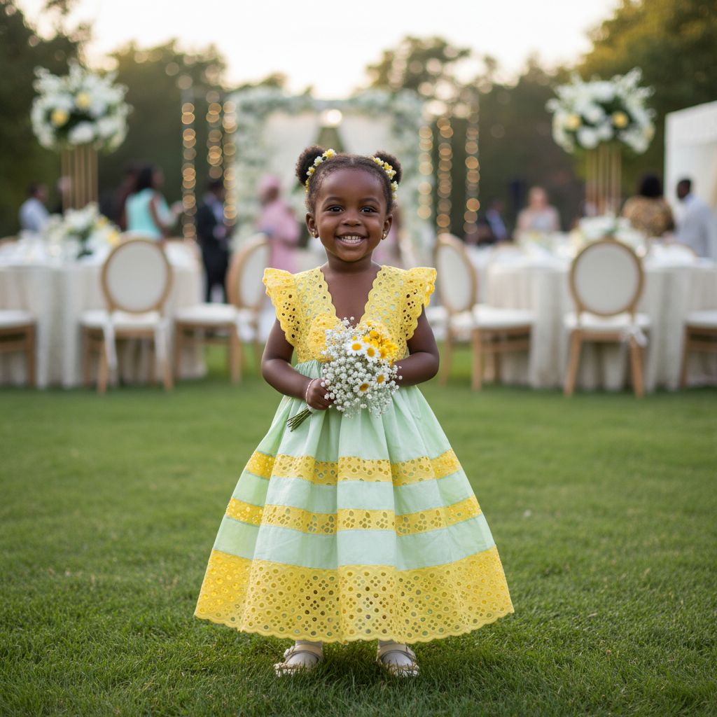 Offrez à votre petite fille une allure inoubliable pour toutes les grandes occasions grâce à cette robe cérémonie fille 2 ans, un modèle chic et raffiné spécialement imaginé pour les moments les plus précieux de son enfance. Parfaite pour un mariage, un baptême ou toute autre célébration, cette robe verte et jaune enfant séduit par son style élégant et son charme intemporel. Confectionnée dans un tissu léger et subtilement satiné, la robe garantit à la fois douceur et aisance à votre fillette, lui permettant de profiter pleinement de sa journée. Sa coupe pensée pour les enfants de 2 ans assure un maintien optimal et un confort sans compromis, même lors des longues cérémonies ou des fêtes animées. Le corps de la robe arbore un délicat vert menthe pastel, mis en valeur par de larges bordures jaunes éclatantes en broderie anglaise. Ces détails raffinés, à la fois fleuris et ajourés, confèrent à cette robe baptême fille chic une touche artisanale et sophistiquée, tout en restant ludique et adaptée à l’âge de l’enfant. Le col en V profond, encadré par de superbes finitions brodées, apporte une note romantique et vintage, tandis que les fronces et volants à la taille offrent du volume et du mouvement à la silhouette. Cette robe élégante mariage fille est idéale pour celles qui souhaitent conjuguer tradition et modernité lors d’une fête. Les petits détails pensés avec soin, comme la qualité des finitions et l’association harmonieuse des couleurs, font de cette robe enfant broderie anglaise un vêtement cérémonie enfant fille unique. Polyvalente, la robe pastel mariage enfant conviendra aussi bien à un événement formel qu’à une fête d’été, grâce à sa légèreté et à son esprit frais. Offrez à votre fillette une robe satinée fille occasion spéciale qu’elle aura plaisir à porter et dans laquelle elle se sentira belle et à l’aise. N’attendez plus pour sublimer ses moments les plus importants avec cette robe fête fillette 2 ans, symbole d’élégance et de douceur. Ajoutez une touche de magie à sa garde-robe et créez des souvenirs précieux dès aujourd’hui.