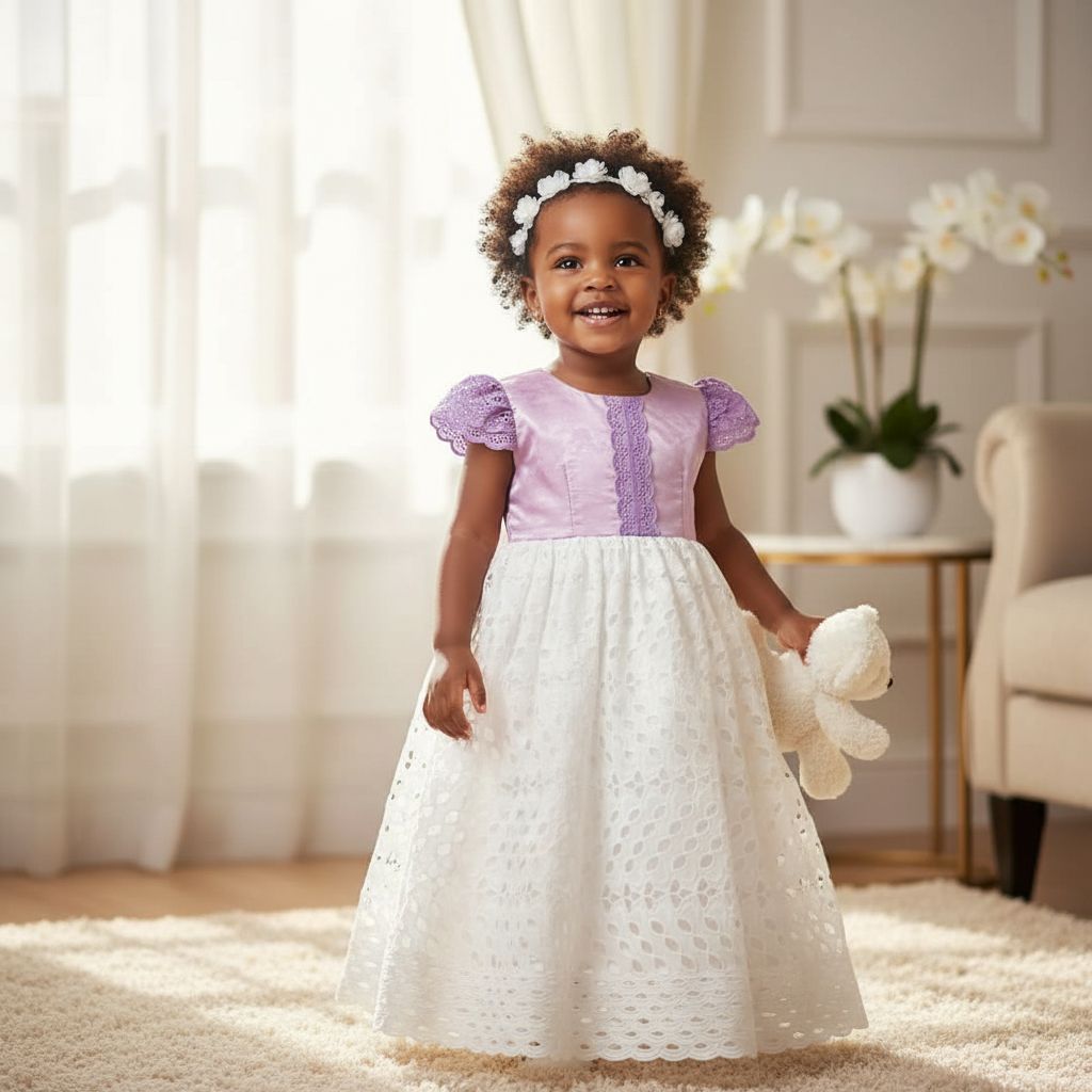 Robe cérémonie fille 2 ans élégante en satin, dentelle lilas et broderie anglaise blanche, parfaite pour mariage, baptême ou fête, style chic et raffiné. ❀ Taille idéale pour fille 2 ans ❀ Couleur mauve avec haut rose poudré, manches dentelle lilas et jupe blanche broderie anglaise ❀ Matières nobles, légères et confortables, finition haut de gamme