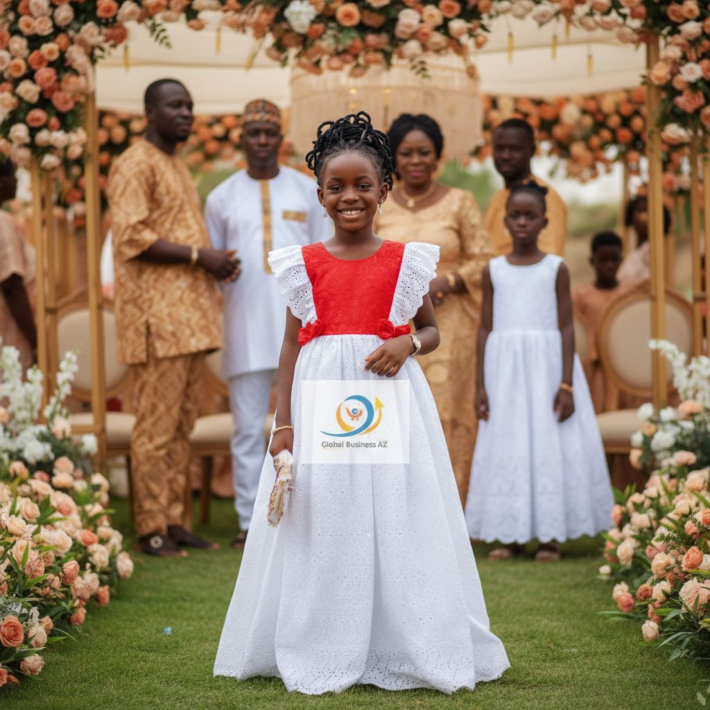 Cette robe longue fillette rouge se distingue par son haut en tissu uni rouge vif, apportant une touche festive et chaleureuse, tandis que la jupe et les manches en coton brodé blanc offrent un contraste éclatant et raffiné. La broderie anglaise ajourée, présente sur la jupe et les manches courtes volantées, invite à la délicatesse et au romantisme, rappelant le charme intemporel des **robes traditionnelles africaines fillette** et des vêtements de cérémonie d’exception.